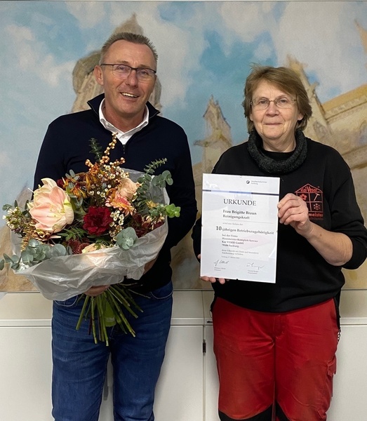 Wir gratulieren unserer Mitarbeiterin Frau Braun ganz herzlich zu Ihrem 10-jährigen Jubiläum. Für 10 Jahre Treue und vertrauensvolle Zusammenarbeit möchten wir uns ganz herzlich bei ihr bedanken. Gleichzeit wünschen wir Frau Braun für die kommende Zeit vor allem Gesundheit, Erfolg und freuen uns auf noch viele weitere Jahre zusammen mit ihr.