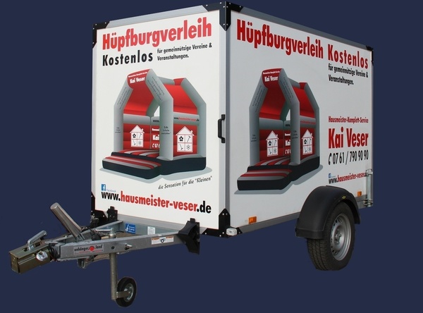 Damit Sie unsere Hüpfburg ab sofort noch besser und einfacher transportieren können, haben wir uns einen speziellen Anhänger für unseren kostenlosen Hüpfburgverleih für Vereine und gemeinnützige Zwecke zugelegt. Dieser Hänger kann mit dem Führerschein Klasse B gefahren werden. Sollten Sie keine Möglichkeit haben, den Hänger zu holen, finden wir bestimmt eine Möglichkeit, dass wir Ihnen den Hänger zum vereinbarten Zeitpunkt anliefern können.