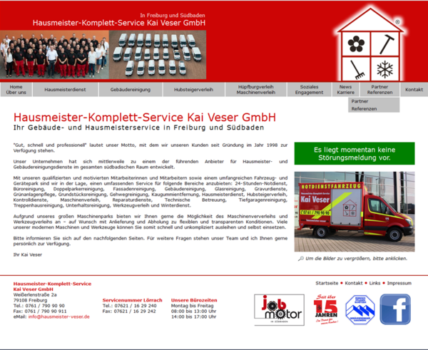 Mit Wirkung zum 1. Juli 2012 wurde die HBT Hausmeisterdienst GmbH zur Firma Hausmeister-Komplett-Service Kai Veser GmbH umfirmiert. Zwei starke Partner bieten damit künftig einen umfangreichen und leistungsstarken Service für die hochwertige Objekt- und Gewerbebetreuung im gesamten südbadischen Raum an. Die von Kai Veser im Jahr 1998 ursprünglich als Einzelunternehmen gegründete Firma zählt heute zu den größten und führenden Dienstleistern in Südbaden.